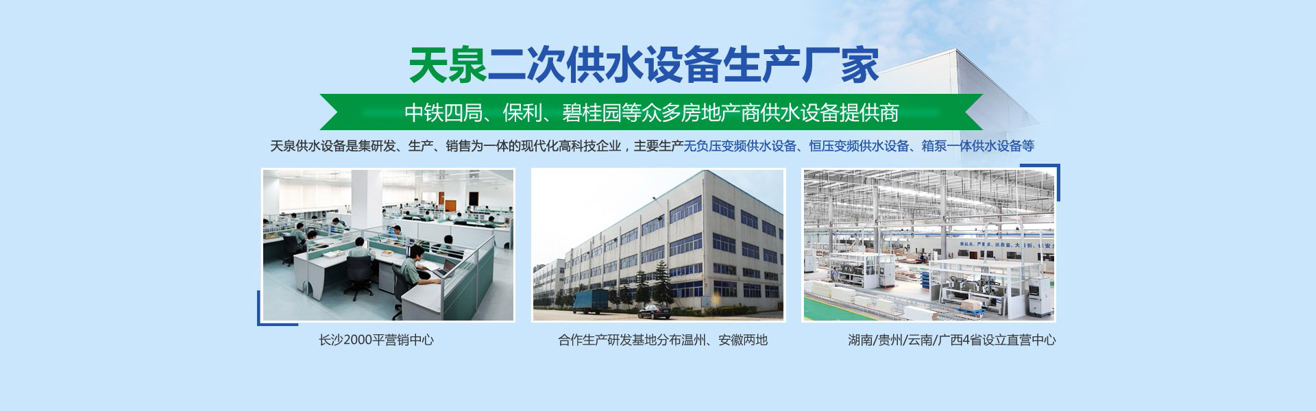 長沙天泉供水設(shè)備有限公司位于長沙雨花經(jīng)濟開發(fā)區(qū)。公司是集研發(fā)、生產(chǎn)、銷售為一體的現(xiàn)代化科技型企業(yè)公司生產(chǎn)銷售的產(chǎn)品有無負(fù)壓變頻供水設(shè)備、自來水加壓泵站、變頻調(diào)速恒壓供水設(shè)備、智慧標(biāo)準(zhǔn)泵房、智慧水務(wù)、一體化預(yù)制泵站、循環(huán)水系統(tǒng)工程等二十幾大類別。